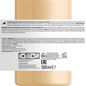 L’Oréal Professionnel Absolut Repair Shampoo is a professional-grade cleanser formulated to restore strength, softness, and manageability to damaged or weakened hair. Infused with gold quinoa and protein, this nourishing formula gently removes impurities while helping to reduce breakage, reinforce the hair fiber, and enhance overall smoothness.